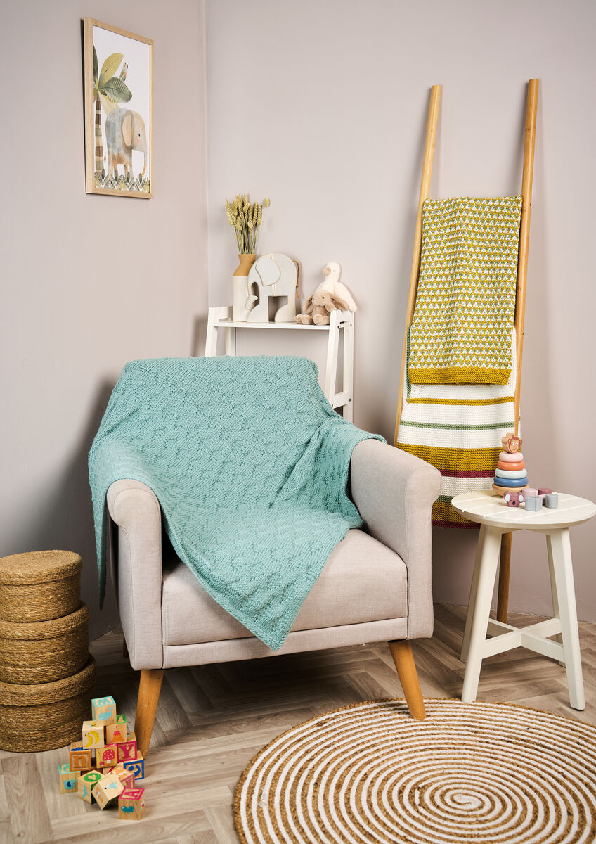 Designed by Georgia Farrell, this lovingly handknitted baby blanket is knitted in a single, soothing colour of Baby Cashsoft Worsted, highlighting the natural beauty of the yarn. An all-over pattern of Georgia’s trademark knit and purl texture creates a beautifully tactile fabric, whilst the luxurious blend of soft cashmere and wool makes the blanket feel wonderfully warm and comforting, perfect for little one.