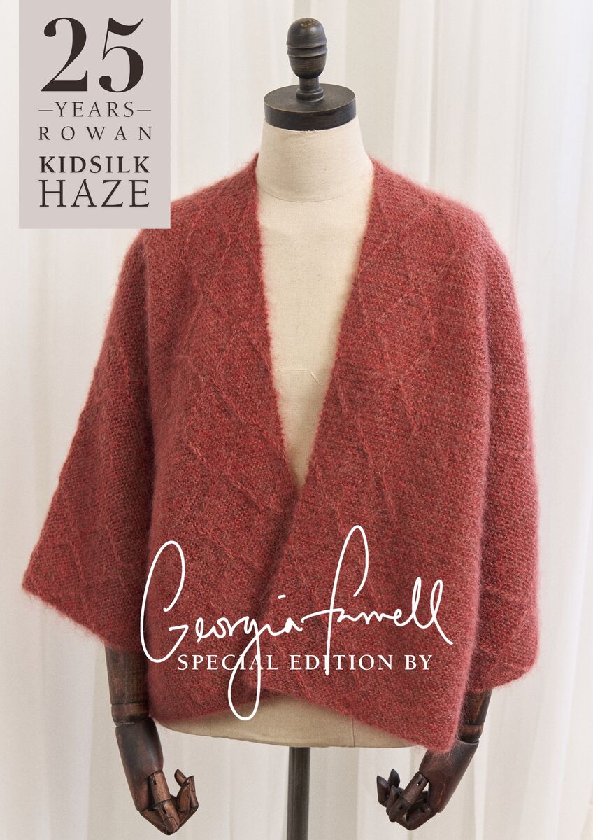 To celebrate 25 years of Kidsilk Haze, Georgia Farrell has reimagined her much-loved Garter Stitch & Diamonds Jacket using the rich shades Burnt Orange and Walnut. A strand of each colour is held together throughout, creating a subtle marl effect, demonstrating the true versatility of this yarn and its colour palette. This striking open-fronted jacket features a diamond cable pattern at each front edge, whilst wide sleeves and oversized side vents make for an easy-to-wear and casual fit.