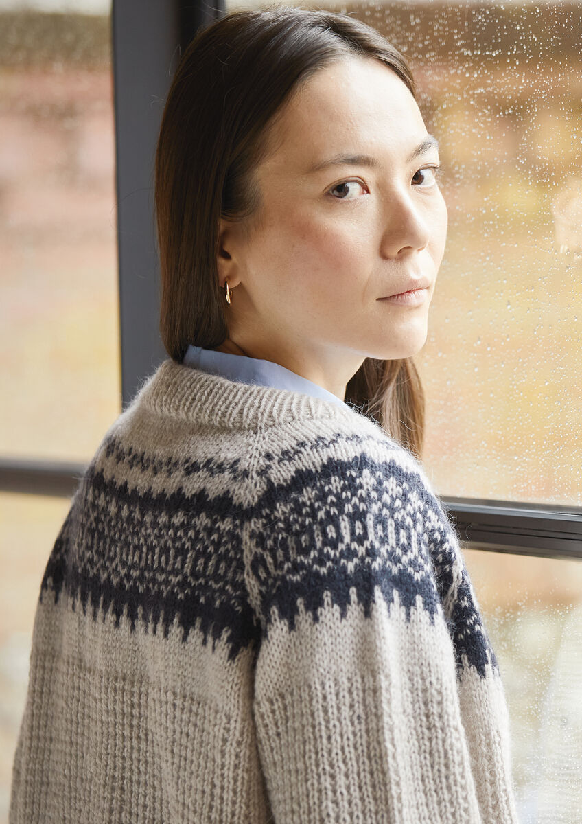 This charming top-down cardigan by Chloe Thurlow is a modern twist on the traditional. Details such as a mock rib and colour tipped cuffs are clever additions to this nostalgic Fair Isle yoke knit. Knitted using two contrasting shades of Kid Classic.