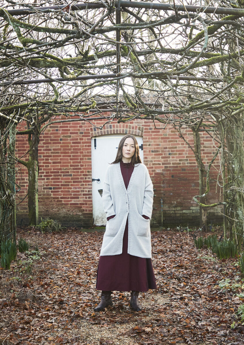Lisa Richardson’s long length cardigan has a classic, simplistic beauty. Smooth stocking stitch, delicate edgings and large garter stitch pockets come together to create a winter knitwear essential. Knitted using one shade of Kid Classic.