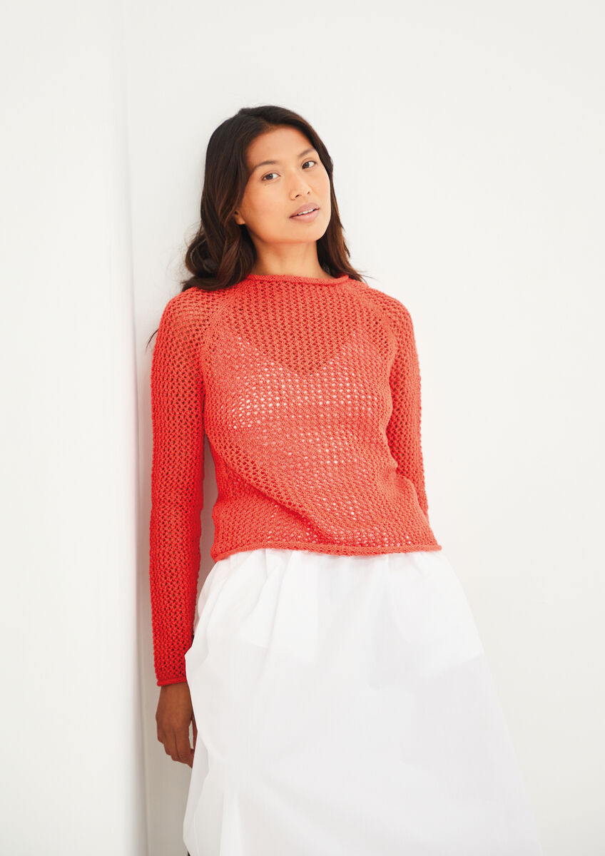 Lightweight and airy, this open-knit cotton sweater blends comfort with summer-ready style. Knitted top down and in the round, this versatile knit is ideal for layering on warm days and cool evenings.