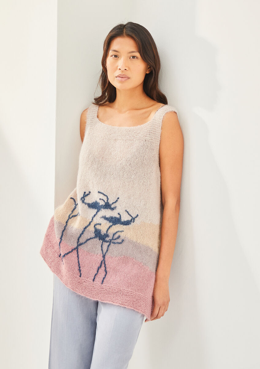 Add effortless elegance to your summer days with this long-length knitted vest, beautifully enhanced by a delicate silhouette-style motif that adds a subtle touch of charm and sophistication.