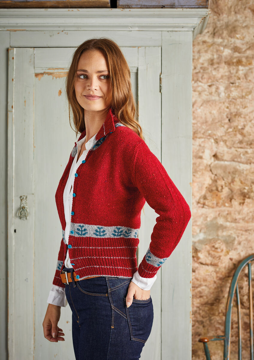 Knit this elegant collared cardigan from Dee Hardwicke's Colourwork Knits book. The button down cardigan features set in sleeves and a beautiful intarsia motif panel along the midriff.