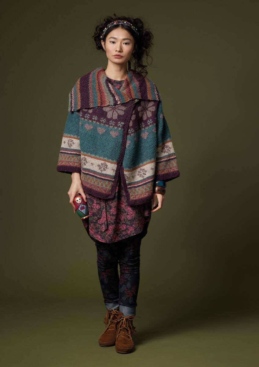 Knit this ladies oversized cardigan, designed by Marie Wallin using the wonderful, tweedy yarn Felted Tweed Aran, a blend of 50% merino wool, 25% alpaca and 25% viscose. This fairisle jacket has moss stich detail on the edges and collar, oversized cardigan style sleeves and is fastened with a kilt pin.