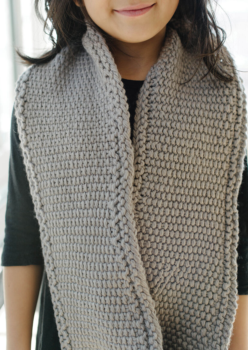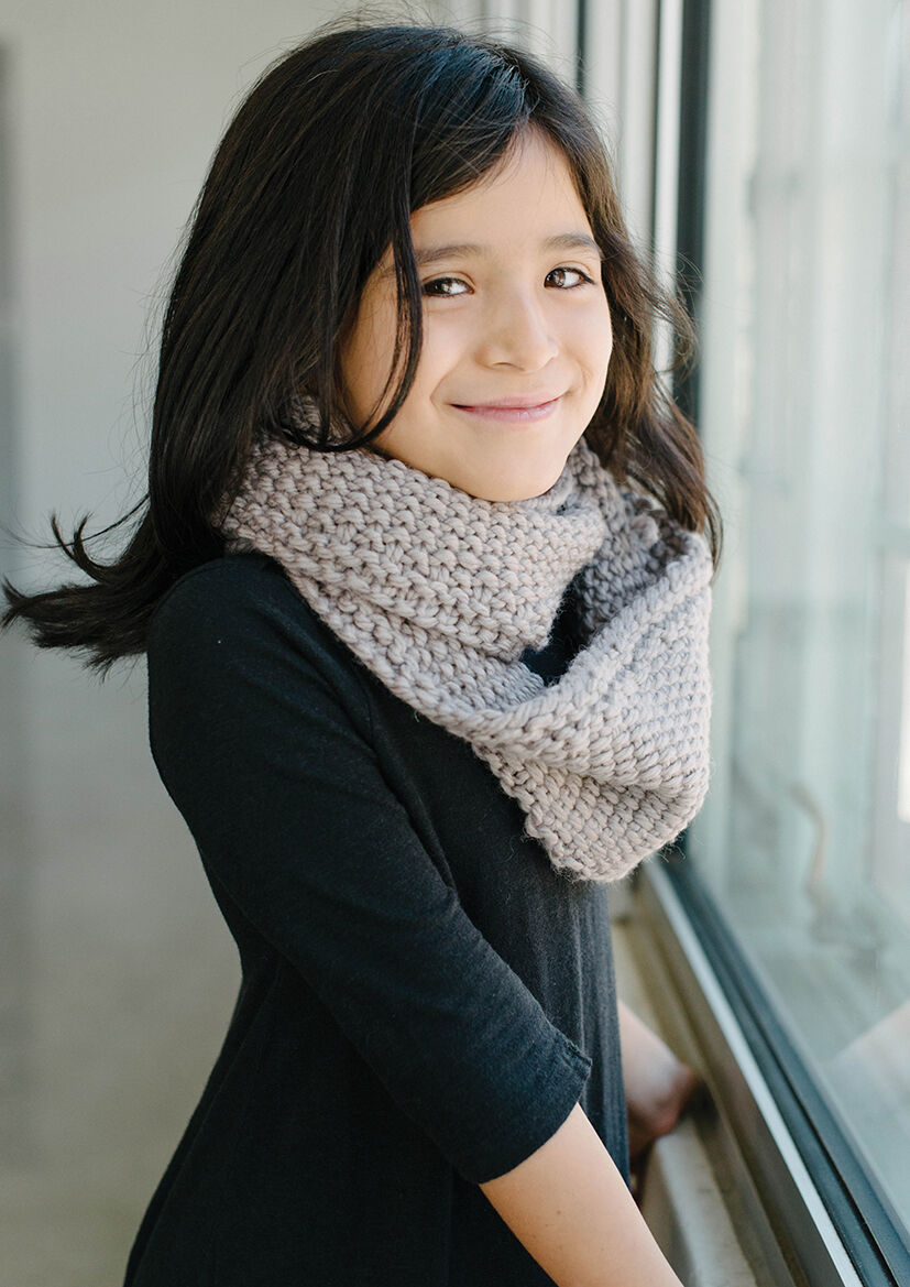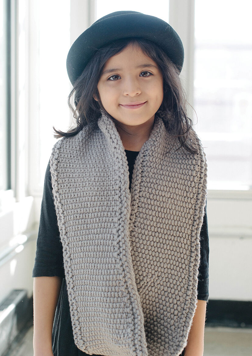 This textured cowl is knitted in Big Wool and is perfect accessory for children. Big Wool is one of our popular yarns and a 100% wool yarn. The cowl was designed by Jen Geigley.