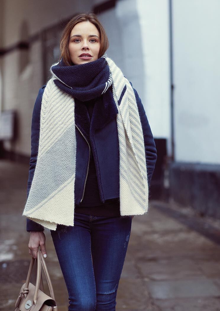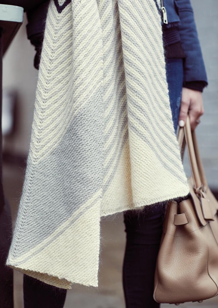 This unique generously-sized wrap is worked in stocking stitch in an eye-catching striped chevron pattern. Contrasting shades of Kid Classic create the drama.