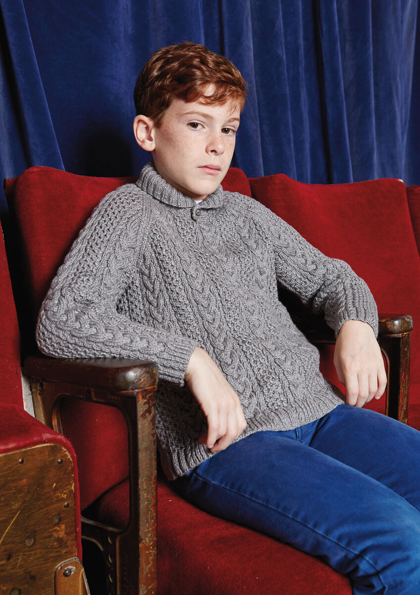 Featuring all-over cable patterns, a buttoned shawl collar and raglan sleeves, this sweater was designed by Martin Storey using Softyak DK, a blend of 76% cotton, 15% yak and 9% nylon.