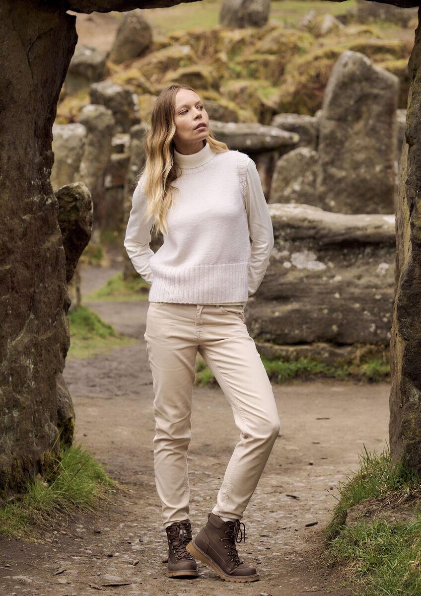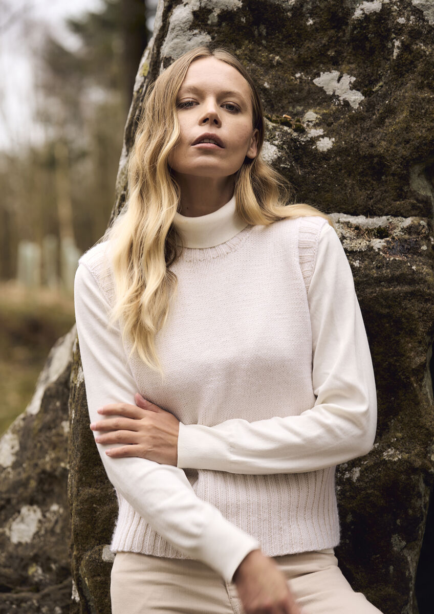 Ce gilet simple avec une encolure ronde de Quail Studio est tricoté en jersey endroit et bordé de côtes. Réalisé en Alpaca Soft DK, il s'agit d'un tricot automne/hiver polyvalent.