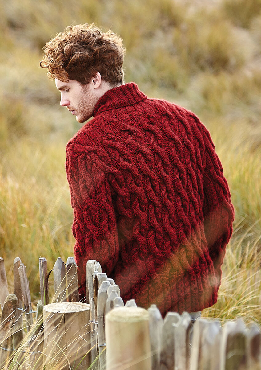 Knit this mens cable cardigan from the Brushed Fleece brochure designed by Martin Storey using Brushed Fleece (extra fine merino and baby alpaca). With shawl collar, wrapover front detail and set in sleeves. This knitting pattern is for an experienced knitter.