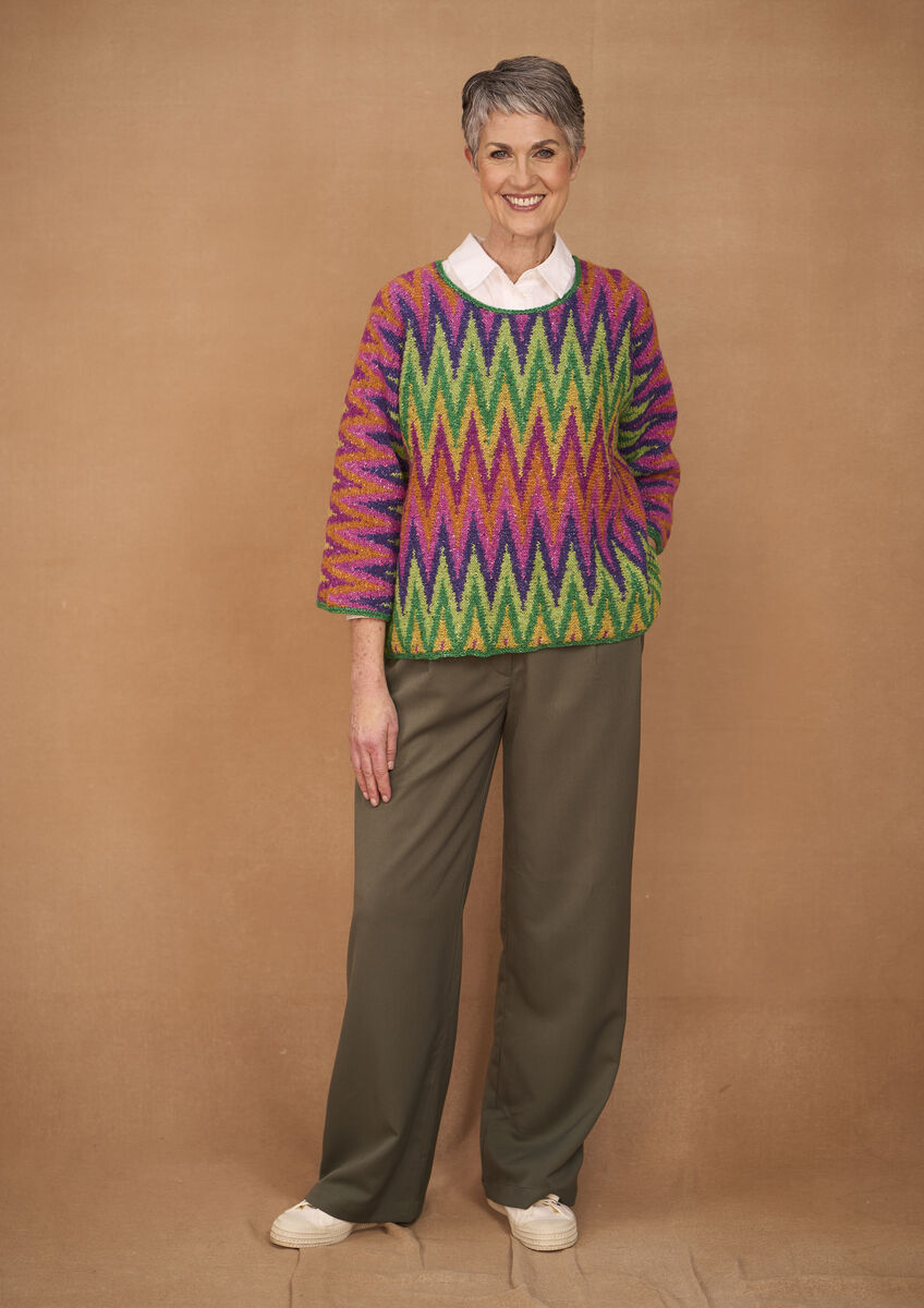 Les couleurs du fil Felted Tweed de Kaffe Fassett sont audacieuses, lumineuses et belles et ce remarquable pull combine intelligemment sept d'entre elles dans un superbe motif en chevrons. Le corps est travaillé latéralement d'un seul tenant, ce qui permet de tirer le meilleur parti de ce design saisissant.