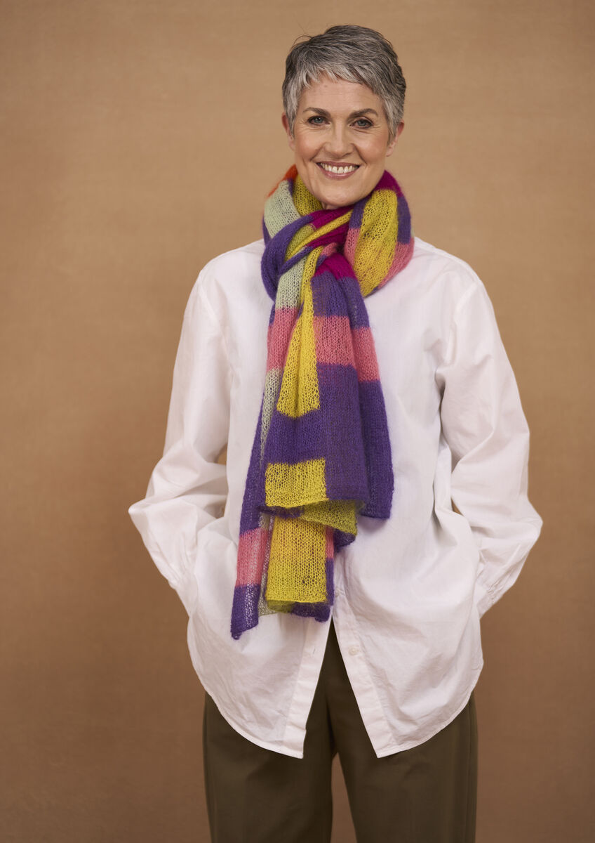 La palette de couleurs du fil Kidsilk Haze de Kaffe Fassett est astucieusement combinée sur cette magnifique écharpe. Le jacquard intarsia utilise sept coloris en blocs entremêlés les uns dans les autres pour créer un accessoire saisissant.