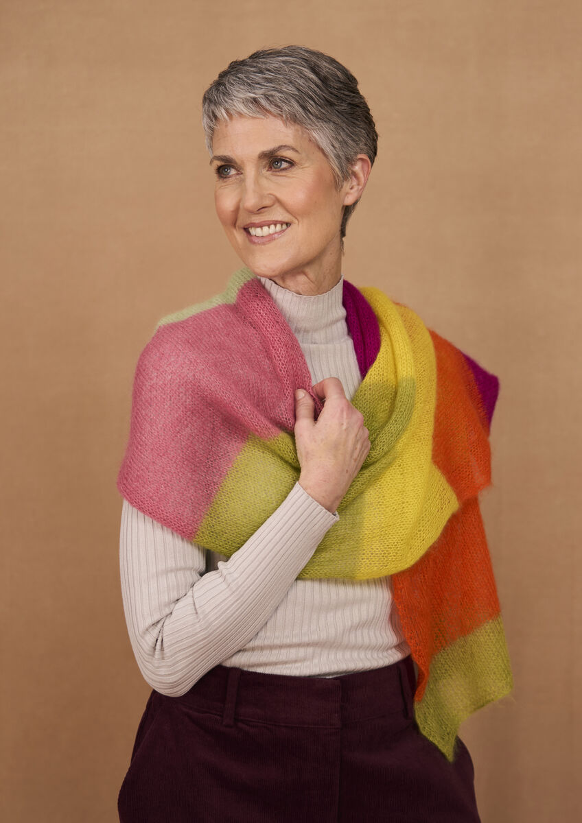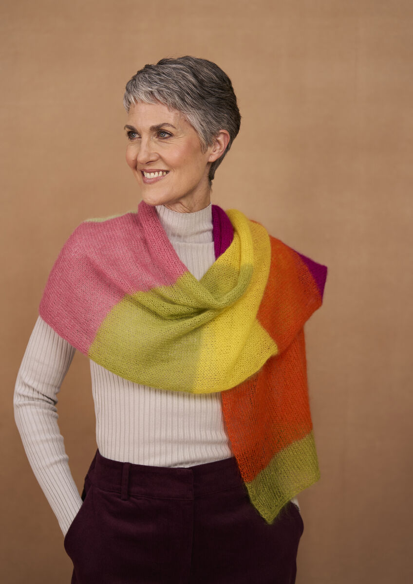 Kidsilk Haze est le fil parfait pour les accessoires légers, et cette écharpe colorée de Kaffe Fassett met en valeur six coloris de sa palette soigneusement choisie. Cette large écharpe en jersey est faite de larges rayures unies ravissantes.