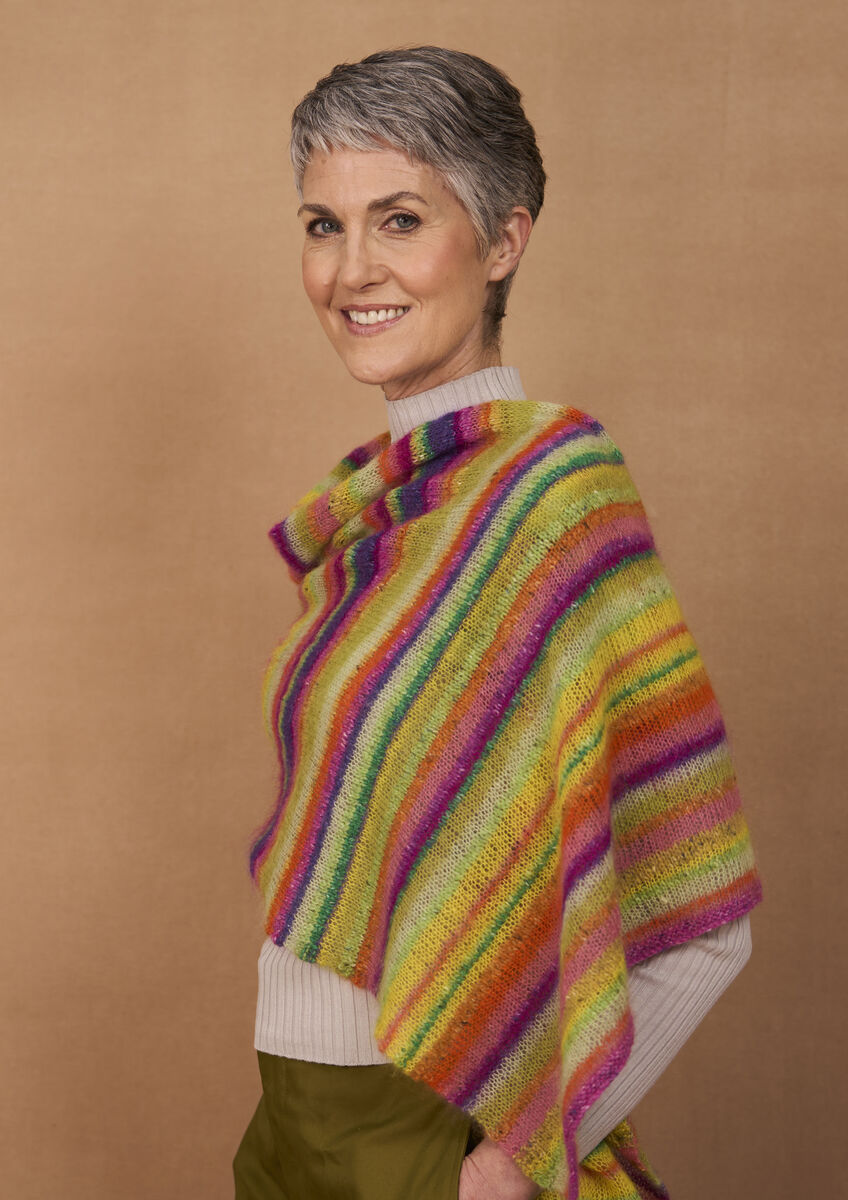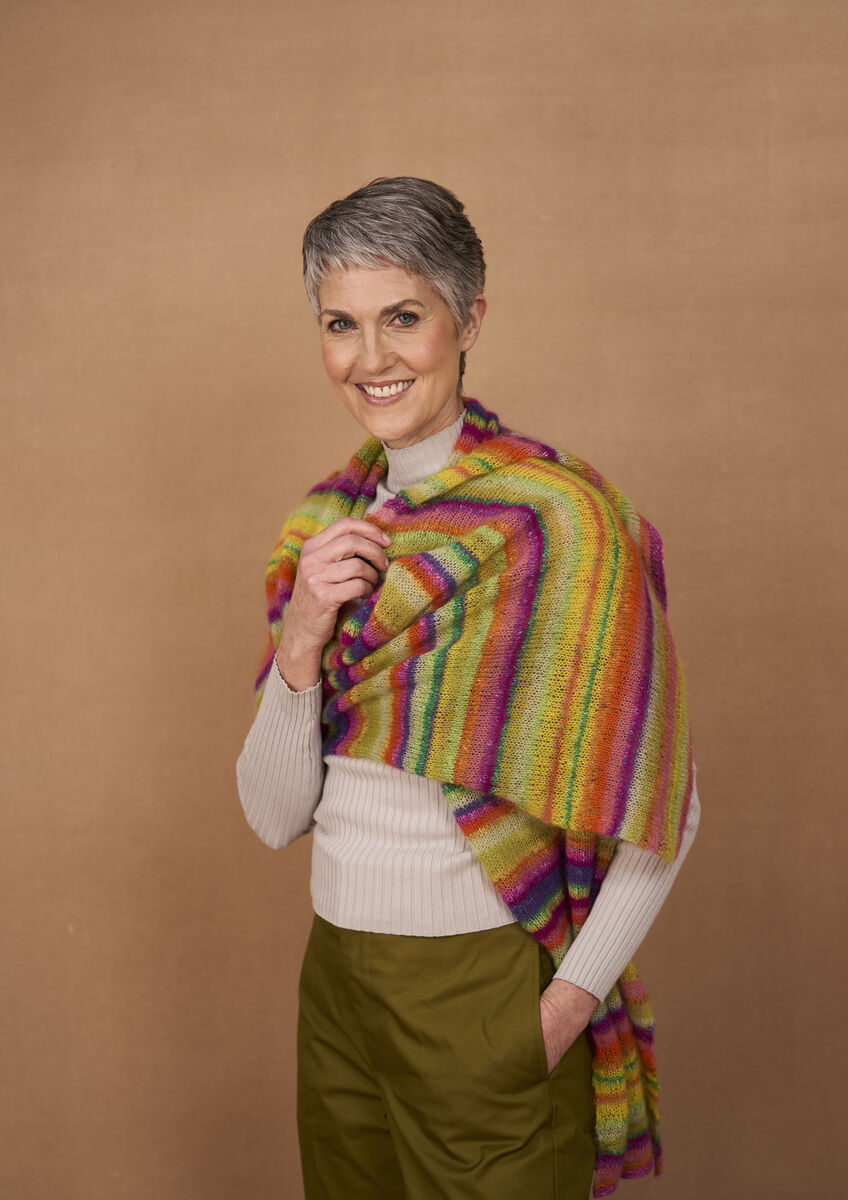 La fabuleuse écharpe rayée de Kaffe Fassett est une célébration de sa nouvelle palette de couleurs des fils Felted Tweed et Kidsilk Haze. Mettant en vedette toute la palette, cet accessoire lumineux et magnifique est un plaisir à tricoter et à porter. Délectez-vous des couleurs qui évoluent constamment en mélant deux de nos fils les plus populaires.