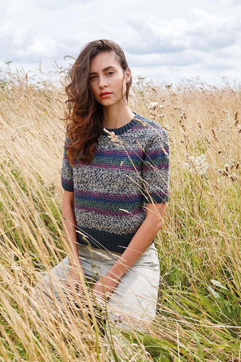 This colourful short-sleeved jumper by Marie Wallin is a great addition to any summer wardrobe. It is knitted in six shades of Softyak DK, a lovely blend of 76% cotton, 15% yak and 9% nylon, and features a fun to knit textured stripe pattern.