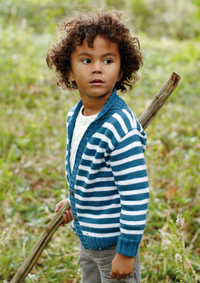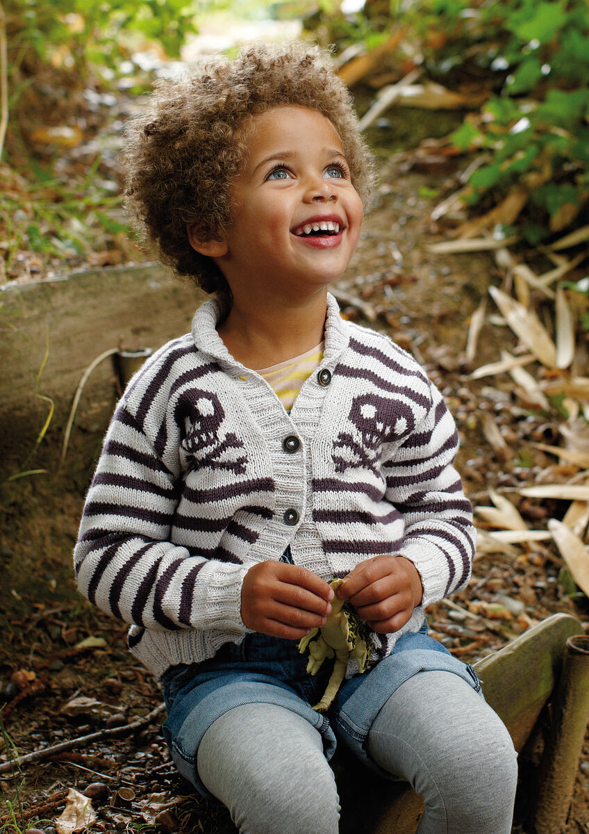 Designed by Martin Storey in our 100% cotton Summerlite 4 ply, this striped cardigan has a beautiful shawl collar detail. The pattern also includes a second version featuring skull and cross bone motifs for the more adventurous little ones!