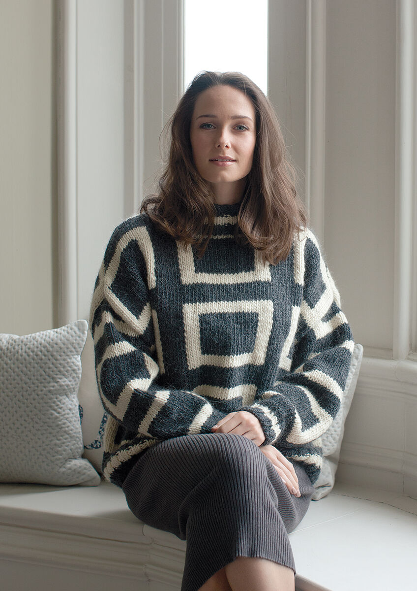 This comfy turtle neck jumper sweater features an eye-catching intarsia design using two shades of Cocoon, a super soft blend of 80% wool and 20% mohair, and drop shoulders that give it a casual look. It was designed by Brandon Mably.