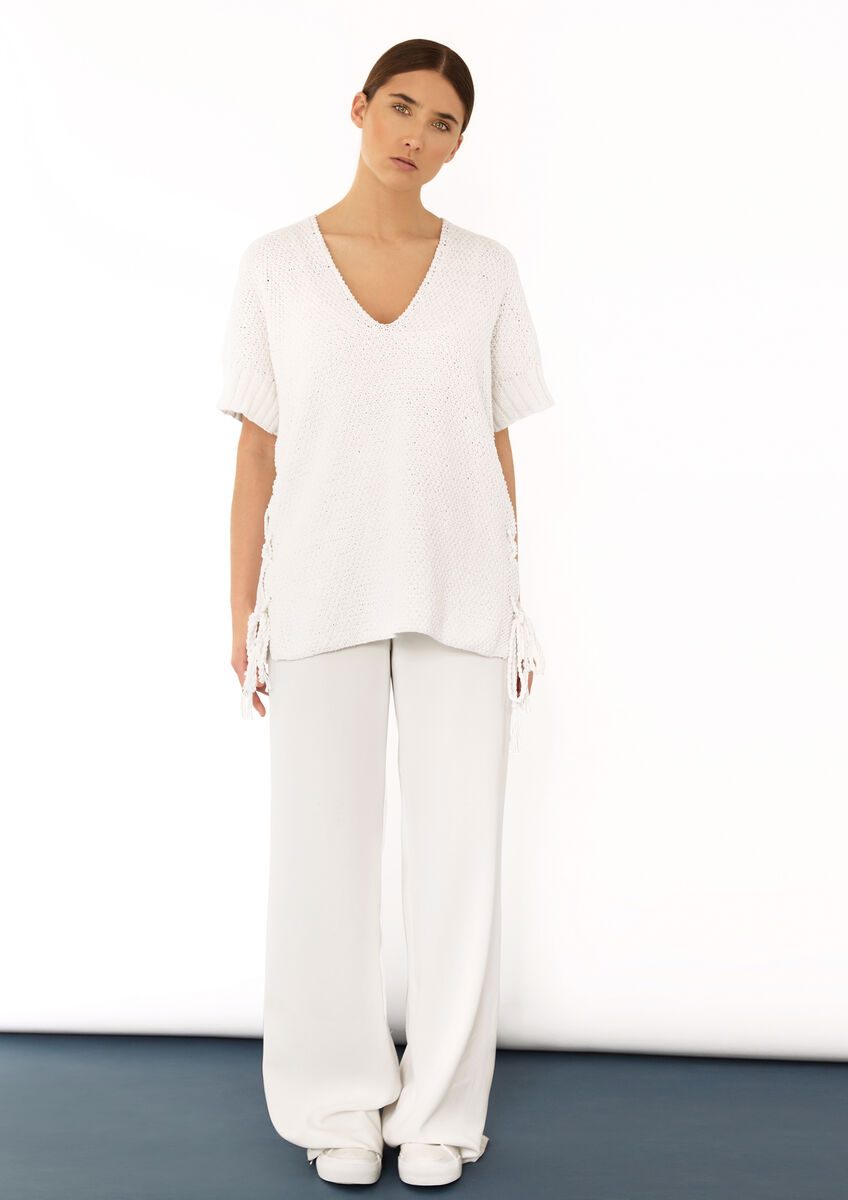 Designed by Kim Hargreaves this poncho V-neck sweater has some interesting details. Worked in double moss stitch it features lacing at the side seams making this a unique addition to any wardrobe. It is knitted in Creative Linen, a summery blend of 50% linen and 50% cotton.