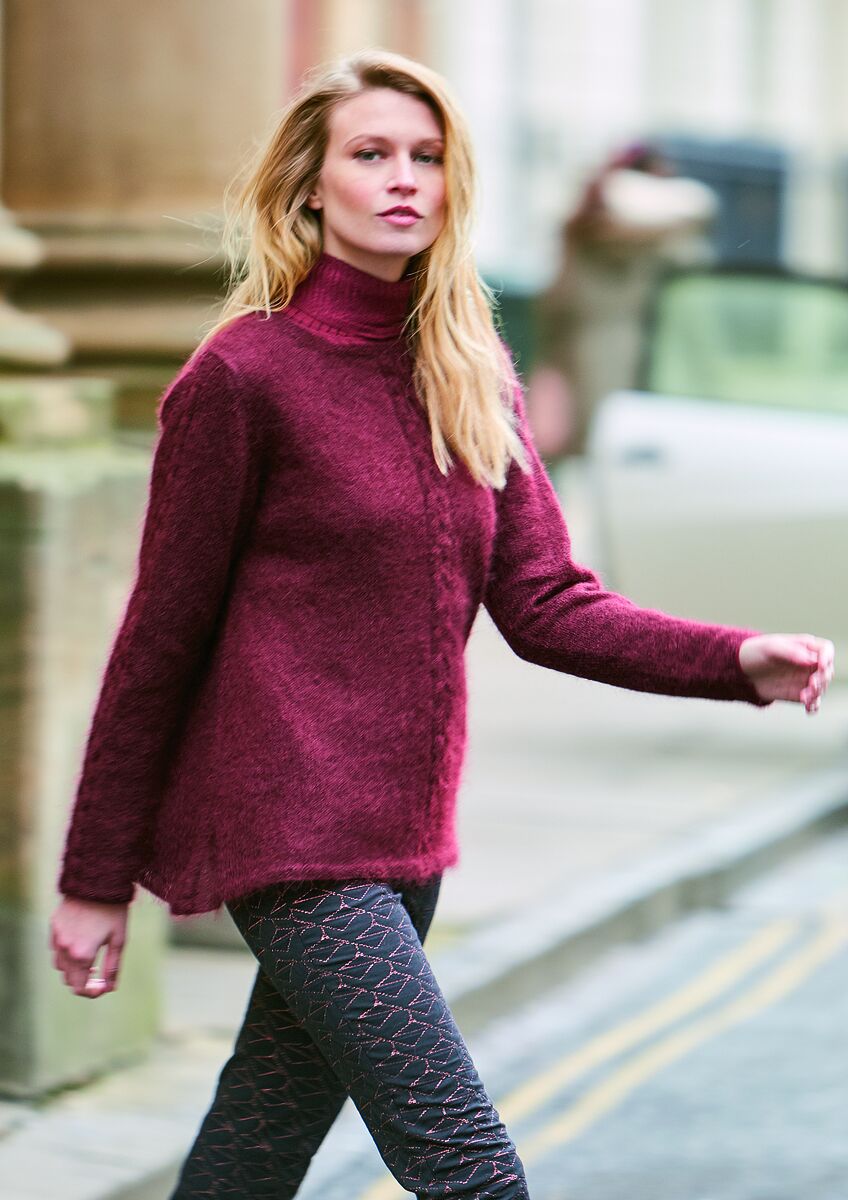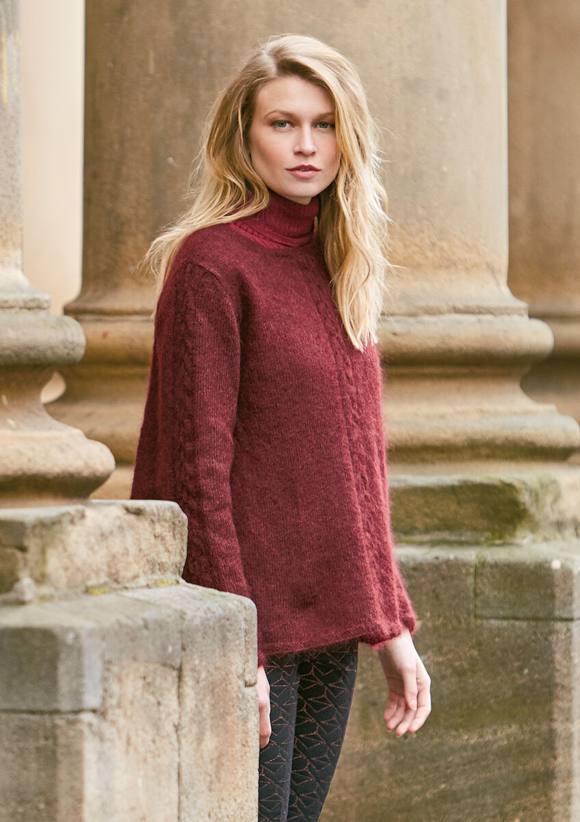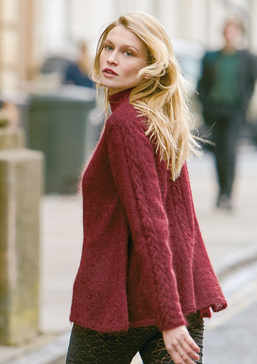 Knit this beautiful A-line sweater in Kidsilk Haze, a luxurious blend of 70% mohair and 30% silk. Designed by Marie Wallin it features a cable column, stocking and garter stitch, as well as set-in sleeves.